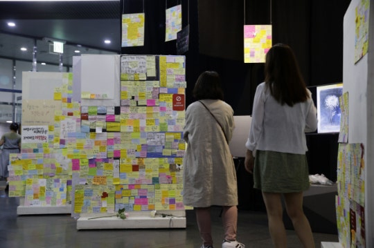 서울 지하철 강남역 10번 출구에 있던 ‘강남역 여성 살인 사건’ 피해자 추모 공간이 서울 중구 태평로 서울시청 시민청으로 옮겨진 뒤, 24일 이곳을 찾은 시민들이 추모의 글이 담긴 포스트잇을 둘러보고 있다. 김명진 기자 littleprince@hani.co.kr