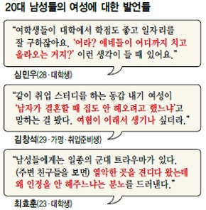 “솔직히 여학생들이 대학에서 학점도 좋고 일자리를 구하는 데 있어서도 남자들의 경쟁자로 나와 있잖아요. ‘어라? 얘네들이 어디까지 치고 올라오는 거지?’ 이런 생각이 들 때가 있어요.”(심민우·28)
